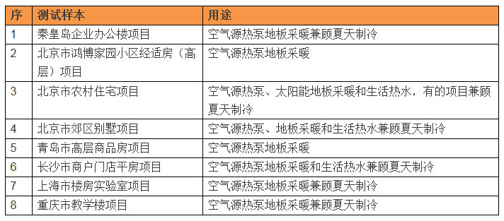 2011 年~2012年采暖季,課題組針對不同建筑類型、不同經(jīng)濟水平、不同氣候區(qū),其中居住建筑既有經(jīng)濟適用房,城鎮(zhèn)別墅還有農(nóng)村住宅,以及小型公建等有代表性 的項目,進行了相關(guān)測試。提取了近萬個低溫空氣源熱泵(太陽能)與地暖的組合系統(tǒng)建筑采暖能效數(shù)據(jù)。測試項目分類如下: