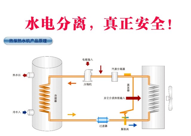 那么,區(qū)別于燃?xì)庀丛。諝饽軣崴髡嬲龅搅怂姺蛛x,安全性能更好,帶給消費(fèi)者更加舒適的使用體驗(yàn)。空氣能熱水器的發(fā)展至今已經(jīng)經(jīng)歷了數(shù)十年的歷史,只不過(guò)真正以獨(dú)立的熱水器形式進(jìn)入到大家的生活中則是近十多年的事情。早期的空調(diào)配置,在制冷系統(tǒng)中安裝上電磁四通閥門(又稱作換向閥),通過(guò)四通閥門切換方向,改變制冷劑的流動(dòng)方向,空調(diào)就可以制熱。空氣能熱水器也是以次原理,壓縮機(jī)排除的高溫高壓蒸汽狀的制冷劑流向保溫水箱里的冷凝器,將熱量傳送給水箱中的自來(lái)水并且進(jìn)行加熱。熱泵熱水器通過(guò)吸收室外空氣中的熱量,電帶動(dòng)壓縮機(jī)進(jìn)行換熱工作,比單獨(dú)的使用電加熱熱水器更加節(jié)能省電,節(jié)能可達(dá)到75%以上。